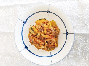 ① カボチャは包丁で皮をそぎ落とし、5cm角に切る。耐熱容器に入れ、ラップをして電子レンジ(600w)で5分加熱する。